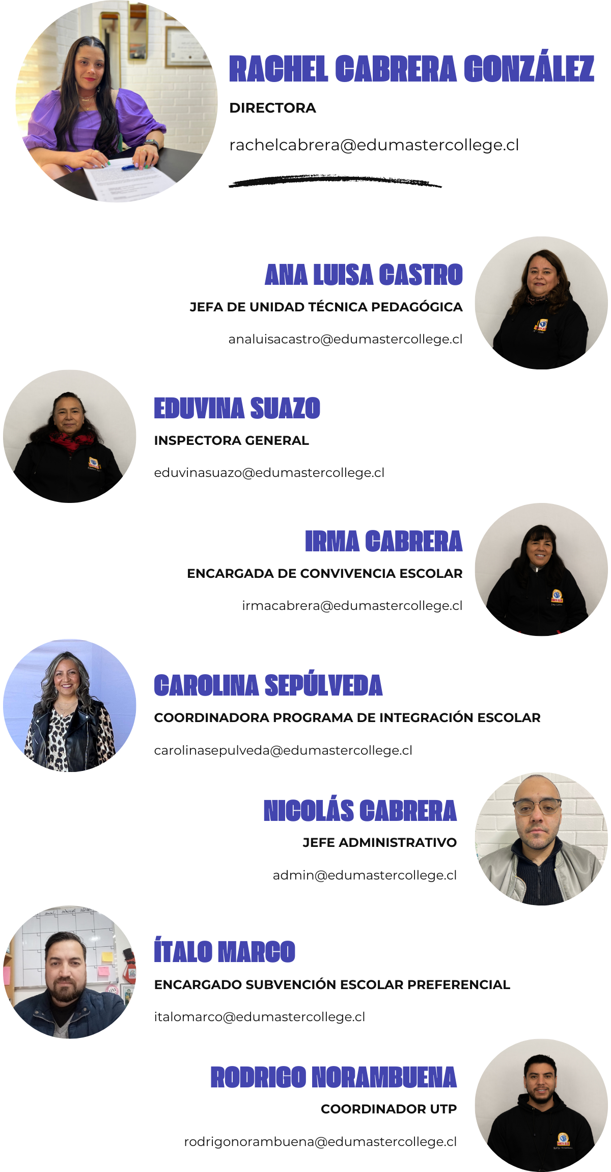 Nuestro equipo cumple funciones fundamentales en la conducción del colegio, asumiendo la responsabilidad de liderar, coordinar y supervisar los distintos ámbitos que dan vida a nuestra comunidad educativa: desde la gestión administrativa hasta el acompañamiento pedagógico de docentes, asistentes de la educación y personal administrativo.